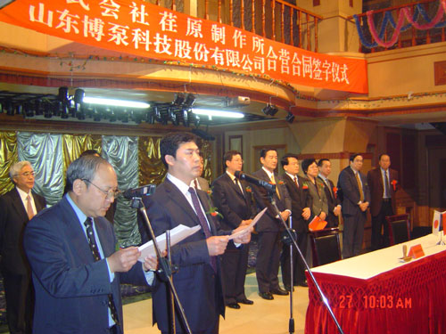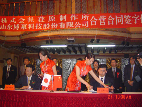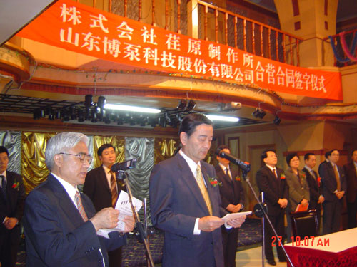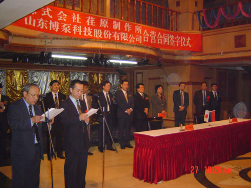 新聞中心 2005年4月27日,在博山萬杰國際大酒店山東博泵科技股份有限公司與日本株式會社荏原制作所正式簽署了注冊資本1100萬美元的合營公司――荏原博泵有限責任公司。該公司的建立將通過引進世界最大的泵企業(yè)――日本株式會社荏原制作所的先進技術(shù),加快大型泵、高壓泵國產(chǎn)化進程,建成具有國際競爭力的一流企業(yè)。為中國水電、核電及超臨界火電項目,為南水北調(diào)等大型水力工程提供高質(zhì)量、高技術(shù)含量的一流泵產(chǎn)品,提升中國機械工業(yè)技術(shù)、質(zhì)量水平,促進產(chǎn)品更新?lián)Q代,為中國電力、冶金、水力事業(yè)的發(fā)展乃至中國國民經(jīng)濟的發(fā)展做出應(yīng)有的貢獻。