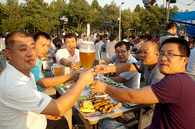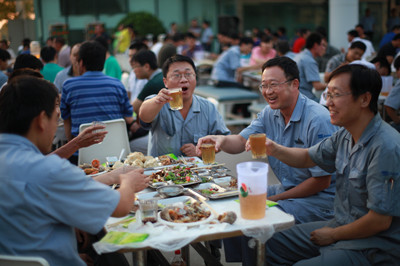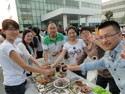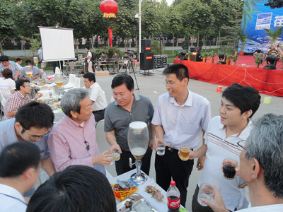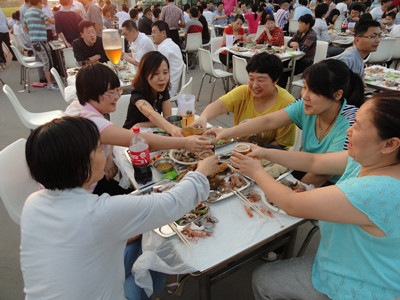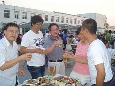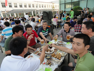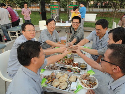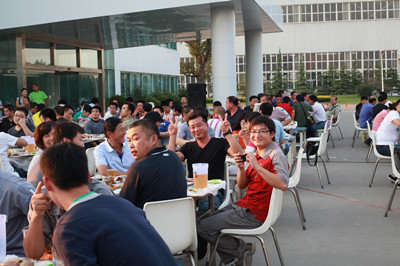 17:30分, “第四屆員工納涼晚會”正式開始。首先是員工聚餐。近400名員工,伴著歡快的樂曲聲,推杯換盞,大快朵頤。公司總經(jīng)理志賀進、常務(wù)副總經(jīng)理王正軍等公司領(lǐng)導走入員工中,與員工們親切交談,敬酒祝愿,整個會場洋溢著一張張歡樂的笑臉。