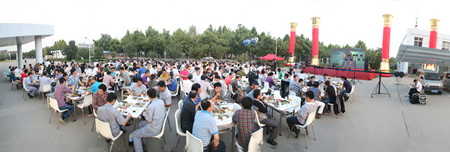 下午5點(diǎn),在夕陽的映照中,公司辦公樓前,忙碌的員工穿梭在會場,辦公樓南面已搭建好舞臺,碩大的LED屏矗立在舞臺上。舞臺兩側(cè)各豎立著兩個團(tuán)結(jié)柱。舞臺前的空地上,已擺放好63張桌子,每張桌子配放6把椅子。桌子上,豐盛的飯菜已放好,靠西邊的草坪旁,是備好的新鮮的青島扎啤。