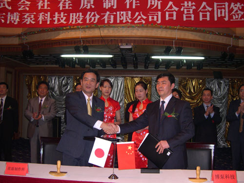 新聞中心 2005年4月27日,在博山萬杰國際大酒店山東博泵科技股份有限公司與日本株式會(huì)社荏原制作所正式簽署了注冊資本1100萬美元的合營公司――荏原博泵有限責(zé)任公司。該公司的建立將通過引進(jìn)世界最大的泵企業(yè)――日本株式會(huì)社荏原制作所的先進(jìn)技術(shù),加快大型泵、高壓泵國產(chǎn)化進(jìn)程,建成具有國際競爭力的一流企業(yè)。為中國水電、核電及超臨界火電項(xiàng)目,為南水北調(diào)等大型水力工程提供高質(zhì)量、高技術(shù)含量的一流泵產(chǎn)品,提升中國機(jī)械工業(yè)技術(shù)、質(zhì)量水平,促進(jìn)產(chǎn)品更新?lián)Q代,為中國電力、冶金、水力事業(yè)的發(fā)展乃至中國國民經(jīng)濟(jì)的發(fā)展做出應(yīng)有的貢獻(xiàn)。