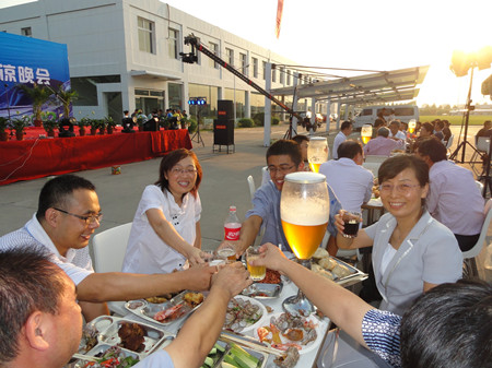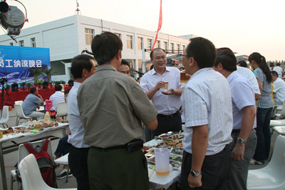 17:30分, “第四屆員工納涼晚會(huì)”正式開始。首先是員工聚餐。近400名員工,伴著歡快的樂曲聲,推杯換盞,大快朵頤。公司總經(jīng)理志賀進(jìn)、常務(wù)副總經(jīng)理王正軍等公司領(lǐng)導(dǎo)走入員工中,與員工們親切交談,敬酒祝愿,整個(gè)會(huì)場洋溢著一張張歡樂的笑臉。